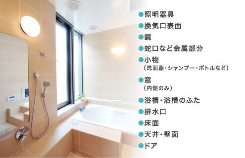 浴室の壁や天井・床・浴槽・鏡・蛇口など全体をキレイに。 水アカ・石けんカス・皮脂汚れ・カビなど汚れに応じて対処していきます。