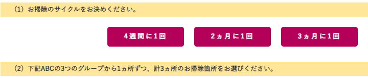 3グループ・9種類のお掃除箇所に加えて、サービスを実施するタイミングも、4週間に1回・2ヵ月に1回または3ヵ月に1回からご都合に合わせてお選びいただけます。