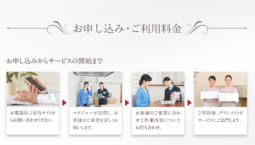 料金に関しましては、事前にサービス内容をお打ち合わせのうえ、人数と時間でお見積りさせていただきます。