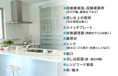 加熱調理器やシンク・吊り戸棚の表面・床・壁など、お手入れが必要な場所をご要望に応じてクリーニング。キッチン特有のこげつきやヌメリ・油汚れを材質に合わせた専用の洗剤や機材を使ってキレイに洗浄します。キッチンに立つのが楽しくなって、お料理もはかどりそうです。