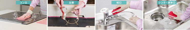 パーツを分解し、細かな部分までしっかり洗浄。コンロのひねり部分など、見落としがちな部分もクリーニング。