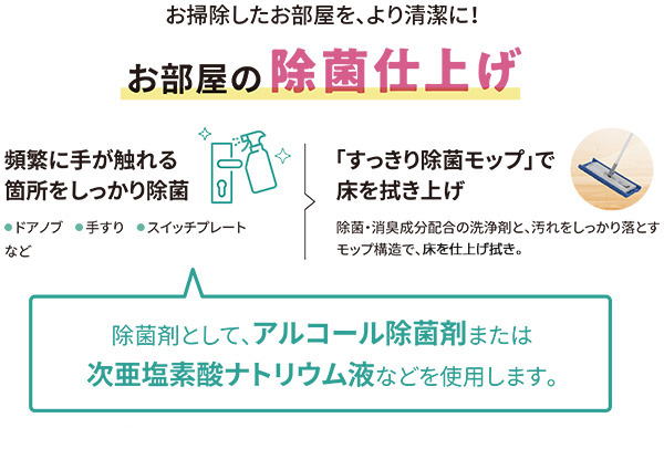 ご希望のお部屋や水まわりを、すみずみまで徹底的にお掃除するサービスです。