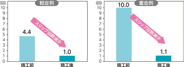 「滑り止めコーティング剤」を施工したフローリングと未施工のフローリングにおいて、関節または神経の疾患を持つ犬(30頭)の歩様を比較解析した結果、施工したフローリングでは滑らない、もしくは滑る回数が減少しました。