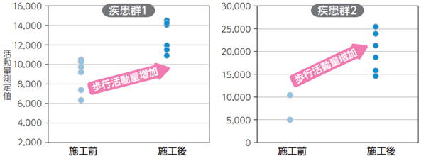 疾病を持つ2頭についてコーティング剤塗布前後の活動量の解析を行った結果、ともに塗布後で活動量の増加が認められました。