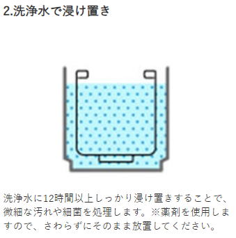 洗濯槽は取り外さず、洗浄水にしっかりと浸け置きすることで、微細な汚れや細菌もすっきりキレイに。