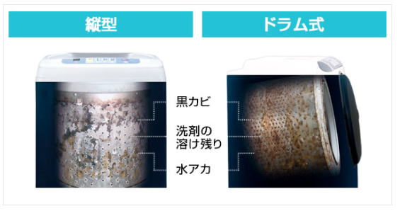 キレイに見える洗濯機でも、洗濯槽の裏側には黒カビや洗剤の溶け残り、細菌など様々な汚れが付着しています。それらの汚れはニオイ・黒い汚れの原因となります。