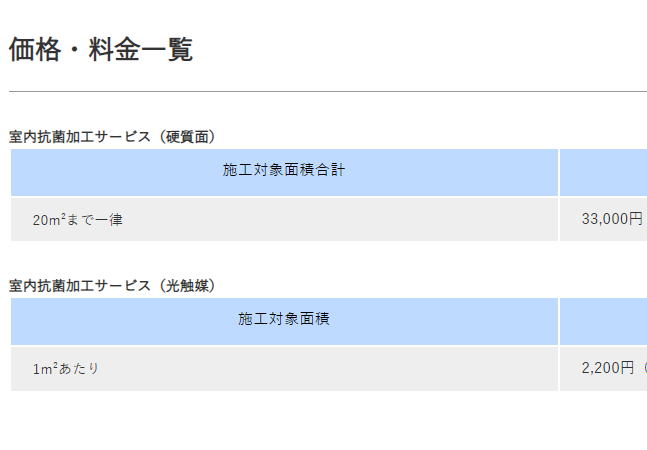 ※室内抗菌加工サービス(硬質面)は20㎡を超える場合は、20㎡ごとに33,000円(税込)追加