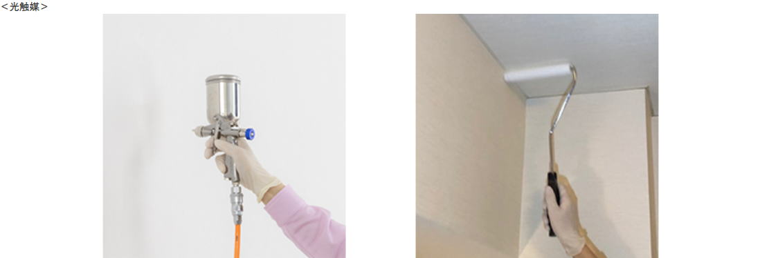 天井や壁などに噴霧・塗布した光触媒は、室内の光で抗菌※1※2・消臭効果(アンモニア)を発揮し、素材に付着している限り効果が持続※2します。また、使用する薬剤に抗ウイルス効果※2※3もあります。